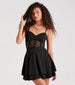 Made for more than just twirling, this crepe mini skater dress is ready to play up your cuteness at the party! Featuring a sleeveless V-neckline, padded bust, adjustable spaghetti straps, a sheer mesh bodice with trim, and a flattering skater silhouette with a layered short-length hem. Complete the look with a charming hair accessory.