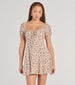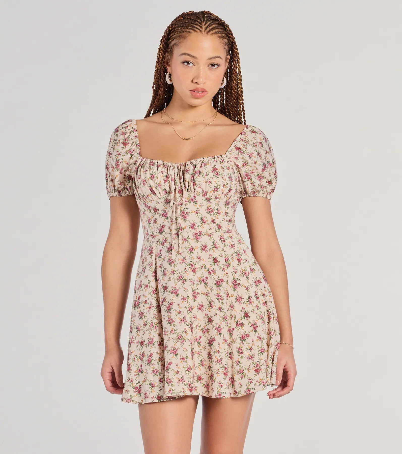 A pretty floral skater dress like this is everything this season! Designed with a dainty rose floral print, this mini dress features adorable puff sleeves and a tie bust that shapes the flattering a-line silhouette. Pair with boots.