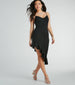 A crepe mini dress with the prettiest presence at rehearsal dinners to date nights! Crafted from a crepe stretch fabric with a polished look and feel, this dress will be the one you'll adore for many occasions. The flattering V-neckline and spaghetti straps accentuate your figure in a bodycon silhouette, while the asymmetrical ruffle trim adds a playful touch. Complete the look in sleek stiletto heels and a clutch for a chic style!