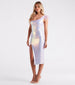 Bring the drama to the evening in the Priah formal sequin dress at banquets or black tie parties! She features a sleeveless one-shoulder neckline with a feathered tank strap, a bodycon silhouette, and a flirty front slit along her midi-length hem. The formal dress is composed of a striking iridescent sequin-knit mesh fabric for the perfect sparkle and a stretchy knit lining. Complete your flawless look with silver rhinestone earrings and bracelet.