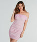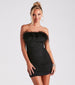 You'll radiate beauty in this curve-hugging glitter knit mini dress! It features a strapless neckline with a fab marabou feather trim, chic ruching down the side seams, and a mini-length hem with a fitted bodycon silhouette. The glitter knit fabric offers plenty of stretch. Style with strappy stilettos for your next night out.