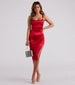 You'll look so radiant in this satin midi dress to make a stunning appearance at cocktail parties and date nights! It features a sleeveless cowl neckline with pleating, spaghetti straps, a strappy back design, a form-hugging silhouette, and a side slit. Complete the look in stiletto heels.