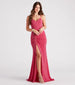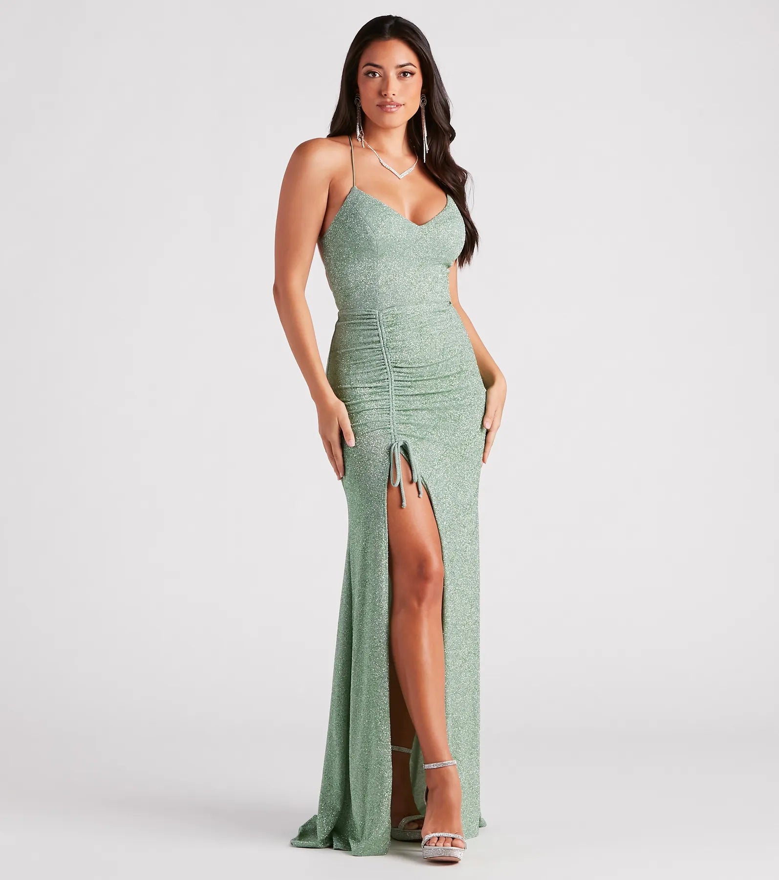 Create a stunning spark in the gorgeous Raina glitter knit mermaid dress at prom, weddings, or fancy parties! She features a sleeveless V-neckline with a built-in padded bust, bungee spaghetti straps, an open back with a cross-back strappy design, a hip-hugging fit, stylish ruching with an adjustable drawstring, a floor-sweeping hem with a short cascading train, a chic front slit, and a mermaid silhouette. The semi-sheer glitter knit fabric includes a mini-length lining. Complete the look in this formal long dress with rhinestone heels.