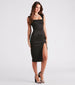 Chic and sophisticated with a hint of sultriness, the Ramona formal midi dress is the perfect cocktail party attire! She features a square neckline, wide shoulder straps with shoulder pad accents, a fitted bodice, a high waist seam, a midi-length hem with a thigh-high side slit, and a curve-hugging silhouette. The scuba knit fabric offers a moderate stretch. Pair with a rhinestone necklace and earrings set for a stylish sparkle.