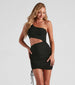 You'll be ready for a chic night out in this alluring bodycon mini dress. It features a sleeveless one-shoulder neckline with a tank strap, a revealing side cutout at the waist, ruching down one side with an adjustable drawstring, and a short, curve-hugging silhouette. Style with rhinestone hoops and strappy heels.