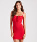 Ready for some sun? Let this rib knit mini dress cue the sunshine! It features a sleeveless scoop neckline, a flirty bust tie with a keyhole accent, spaghetti straps, and a bodycon silhouette. Complete the look in trendy flat sandals for a backyard bbq!