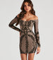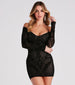 Bring the royalty allure in this off-the-shoulder dress featuring a chic off-the-shoulder neckline, padded bust, long sleeves, and a bodycon short-length hem. The dress showcases a burnout velvet scroll pattern. Complete the look in platform heels.