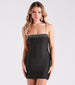 Get ready to turn heads on the dance floor with this sleek mini dress! This clubbing night-out sensation features a sleeveless square neckline adorned with a mesmerizing rhinestone fringe trim that catches the light with every move. The bungee spaghetti straps lead to a captivating low back with a cross-back design, while the mini-length hem and bodycon fit accentuate your curves in all the right places. Crafted from a satin-knit fabric with plenty of stretch, this dress ensures both comfort and style. Style with a sticky bra for a flawless and confident look.