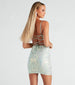 Short, sweet, and oh-so-chic the Ria formal dress is party-perfection! She features a sleeveless, cowl neckline with adjustable spaghetti straps, an open back with lace-up closure for a customizable fit, and a short, curve-hugging silhouette. The party dress is composed of a delicate sequin scroll embroidery on mesh fabric with a knit lining and minimal stretch. Complete your homecoming look in sparkly earrings for a night to remember.