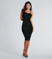 The Roselyn formal midi dress will create an enticing look that will draw all eyes to you! With her chic allure, you'll get all the compliments. She features a sleeveless sweetheart neckline with a marabou feather front trim, adjustable spaghetti straps for a customized fit, a midi-length hem with a sultry back slit accent, and a slim-fit silhouette. The sheer mesh fabric showcases an all-over velvet flocked vintage-style pattern and includes a full-length smooth knit lining. Style this mid-length dress with strappy stilettos for cocktail hour!