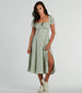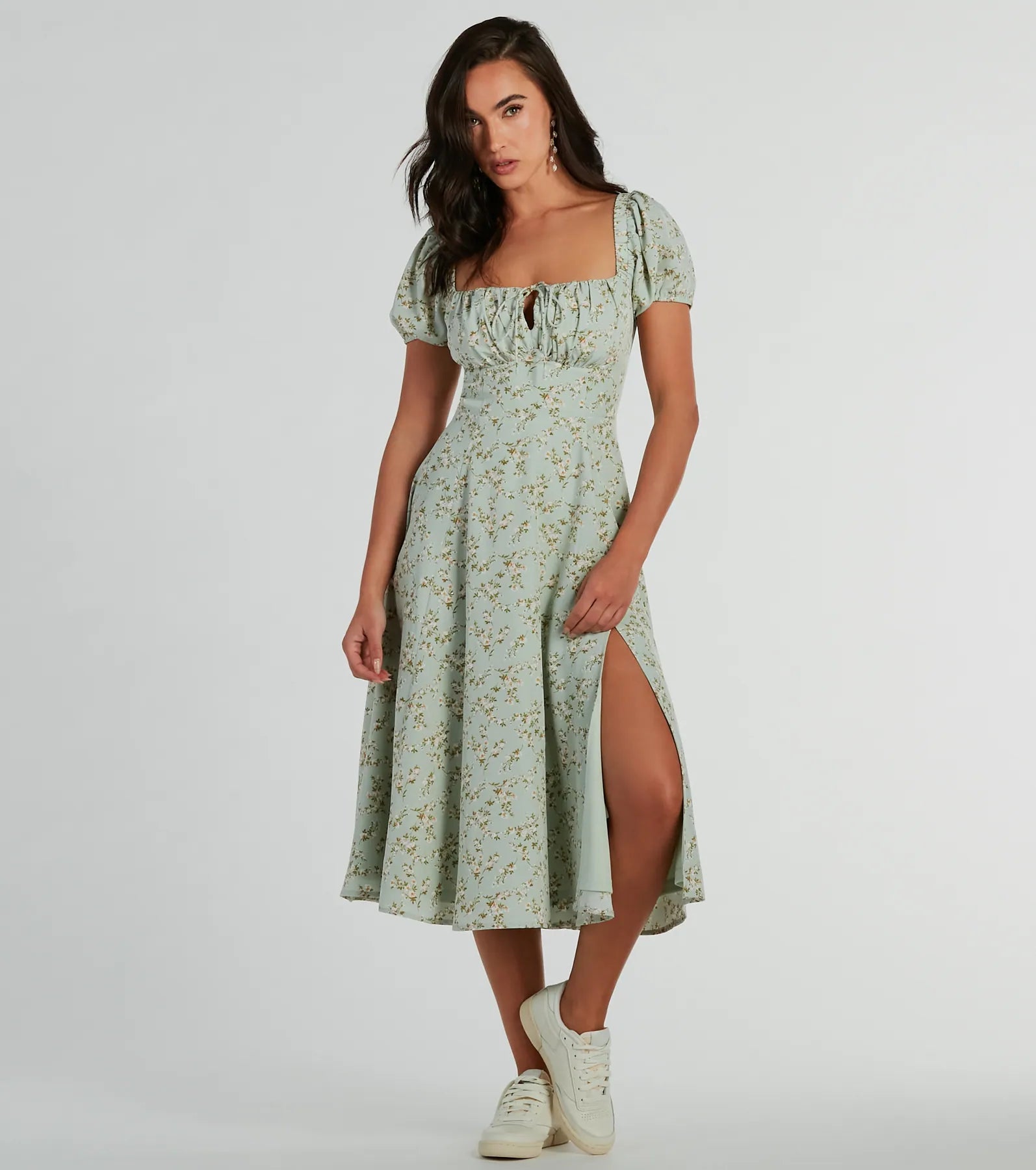 RSVP yes to shower or birthday invites when you have this cute ditsy wildflower tie A-line midi dress in your closet! Embellished with a ditsy wildflower print, this midi-length dress is sure to turn heads. With short puff sleeves and a square neckline, this dress is perfect for casual-dressy occasions. The tie front bust adds a touch of whimsy while the a-line silhouette and front slit provide movement and a flattering look. Complete the look with luxe earrings and tennis shoes.