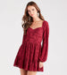 Delicate and dainty, unveil this skater dress for every soiree this season! The short dress features breezy peasant long sleeves, a sweetheart neckline, a padded bust, a smocked back, and a fit and flare silhouette with a ruffled short hem. The dress is designed with a floral jacquard pattern on an airy fabric with a smooth woven lining and no stretch. Complete the look with espadrille wedges for a baby or wedding shower!