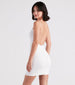 You'll fall in love with the shape of your curves in this body-hugging mini dress perfect for bachelorettes or going wine-tasting! It features a sleeveless V-neck, bungee spaghetti straps, and a backless design with a lower ruched seam to accentuate your assets on the bodycon silhouette. Complete the look in platform wedges.