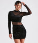 Step and stun in this short dress for a night on the town! It features long sleeves, a mock neck with dual button closures, a keyhole cutout, a burnout velvet scroll, and sheer mesh inserts throughout the body-hugging silhouette. Complete the look with statement earrings.