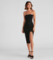 This curve-hugging strapless midi dress is simply alluring! It features a strapless straight across neckline, bold cutouts down each side at the waist, a midi-length bodycon silhouette, and a chic high slit. Style with strappy stilettos.