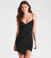 Create a sleek going-out look that is simply flawless with this smooth knit mini dress! It features a sleeveless V-neckline with a wrap design, spaghetti straps, ruching at the waist, a knotted detail with a wrap-front asymmetric overlay, a mini-length hem, and a bodycon silhouette that will showcase your natural curves. The smooth knit fabric offers plenty of stretch. Style with platform heels.