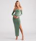 Strut your sultry self in this off-the-shoulder maxi dress for sipping on cocktails at sunset! It features a strapless neckline, fitted long sleeves, a bodycon silhouette, and a high-side slit along the hem. The dress is composed of a slinky knit and stretchy fabric. Complete the look with block heels.