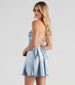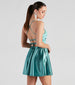 Sleek and flirty, this smooth satin skater dress is a stunning choice. It features a sleeveless cowl neckline with pleated detailing, spaghetti straps, and an open-back lace-up design. The high waist seam flows out to a short skater skirt with hidden side pockets perfect for keeping your hands warm. Style this dress with sparkly rhinestone earrings.