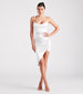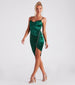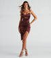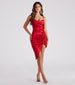 Showcase a sleek sheen in this gorgeous satin midi dress! The knee-length dress features a sleeveless cowl square neckline with pleating, adjustable spaghetti straps for a customized fit, and ruched detailing. A sparkly rhinestone trim cascades from the side to the front leading to a midi-length, asymmetrical hem creating a chic side slit to show off your legs. Style this curve-hugging dress with metallic heels for your next fancy date night.