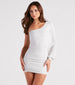 Create a night-out look that is so glitzy and glamorous with this glitter mini dress! It features an asymmetric one-shoulder neckline, a single long balloon sleeve, a front ruched seam, a mini-length hem, and a bodycon silhouette that will hug your curves. The glitter knit fabric includes a knit lining and offers moderate stretch. Style with rhinestone earrings and platform heels.