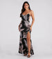You'll be ready for those relaxing beachside strolls in this gorgeous tropical print maxi dress. It features a sleeveless V-neckline, spaghetti straps, an alluring backless design, a flowy, floor-length hem, and a thigh-high front slit. The smooth knit fabric showcases a tropical palm leaf print. Style with slip-on sandals.
