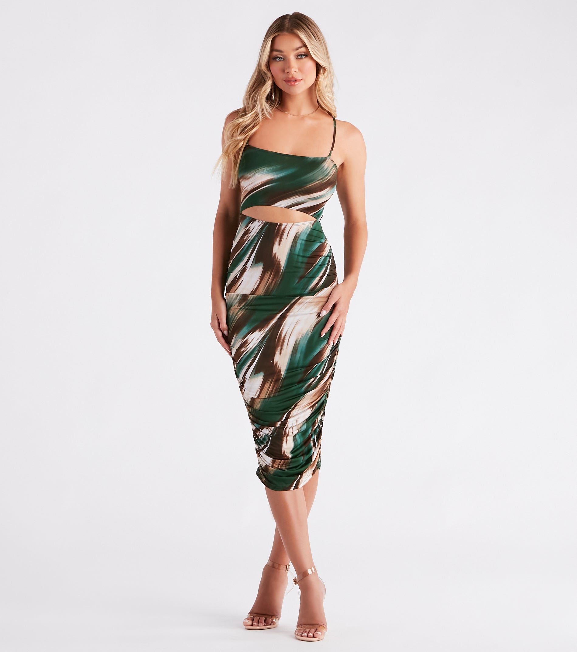 Stand out this season and have all eyes on you in this marble print midi dress perfect for weekend getaways or sunset cocktails! The dress features a sleeveless square neck, spaghetti straps, a cutout bodice, and side ruched seams that accentuate your curves along the bodycon silhouette. Complete the look with a sleek choker necklace.