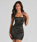 Give off major chic babe energy in the Stella satin mini dress! She features a sleeveless square neckline with mini heat stone embellishments, halter straps, a trendy corset-designed bodice, and a short, curve-hugging, bodycon silhouette. The smooth satin-knit fabric offers a moderate stretch. Style this dress with strappy stilettos.
