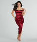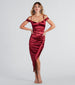 This satin midi dress ensures you'll make a stunning arrival at parties and dressy occasions! Crafted from luxe satin fabric, the midi-length dress features an off-the-shoulder V-neckline, short-sleeve cuffs and spaghetti straps, a form-hugging silhouette, and a front ruched seam that leads to an asymmetrical cut hem. Complete the look in rhinestone heels.