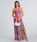 Arrive at your destination in this tropical maxi dress looking stunning and ready for fun! The maxi dress features a strapless neckline, non-slip grip lining, flexible boning, a form-hugging fit, and an effortless high front slit and ruffled flowy hem. Complete your vacation look with a handbag and sandals!