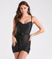 Looking stunning in this satin mini dress is always a factor! The dress features a sleeveless cowl neckline, spaghetti straps, a tie-waist belt with belt loop accents, and a sassy bodycon silhouette with a wrap-style hem. The sleek satin-knit fabric offers plenty of stretch. Complete the look in bold earrings for a cocktail party.