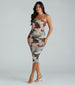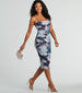 You'll be a stunning vision in this mesh midi dress out for a day date or brunch! It features a sleeveless square neckline, adjustable spaghetti straps, side ruching that accentuates your natural curves, and a flattering bodycon silhouette. The dress is designed with an artsy abstract print on mesh fabric and has a sewn-in knit lining. Complete the look with a trendy denim crop jacket.