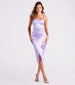 Unveil this satin midi dress for cocktail soirees and dressy rehearsal dinners! The dress features a sleeveless square neck, spaghetti straps that lace up on the back, a bodycon silhouette, and a side pleated seam that creates the faux wrap skirt. The silky smooth satin fabric offers a moderate stretch. Complete the look in block heels.
