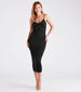 This trendy tie-front midi dress is a stylish summer staple! It features a sleeveless V-neckline, a tie-front design at the bust with a small keyhole cutout, spaghetti straps, a midi-length hem, and a bodycon silhouette that will hug your natural curves. The ribbed knit fabric offers plenty of stretch. Pair with espadrille sandals for happy hour.