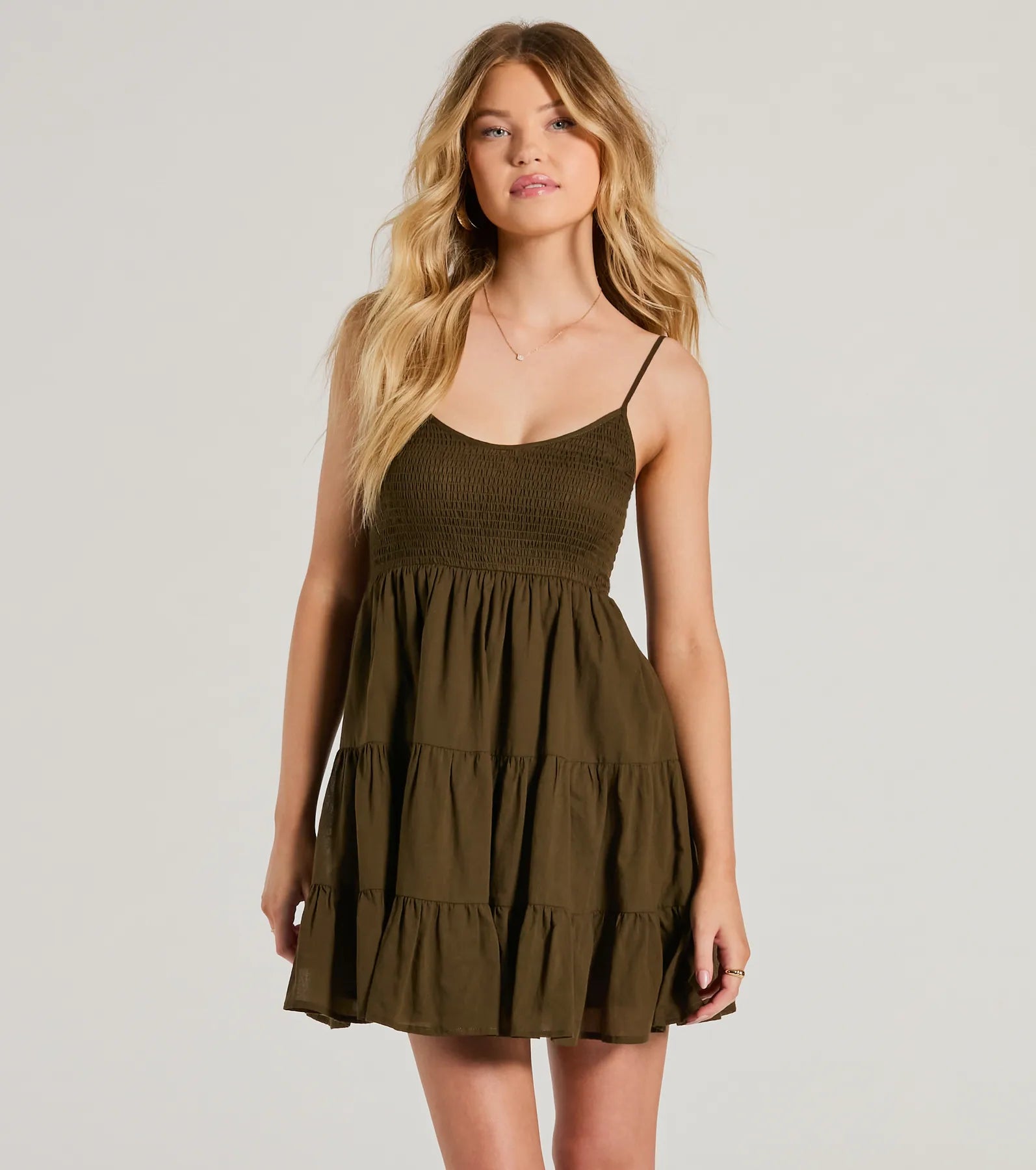 Grab your favorite sunnies cause it's time to take a sunny stroll in this skater dress down by the beach or to the coffee shop! With adjustable straps and a stretchy smocked bust, this dress provides the perfect fit every time. The playful ruffled skater silhouette and short-length hem make it a must-have for any sunny day. Complete the look with strappy sandals.