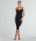 So sweet and chic, this lace-trim knit midi dress is perfect for elevating your date night look! Designed with a stretchy ribbed knit fabric, this mid-length dress includes an airy mesh lining. The sleeveless V-neckline has spaghetti straps and is accented with a dainty sheer lace trim for a stylish touch, and includes an angled underbust seam to accentuate your figure. The bodycon silhouette will show off your gorgeous curves. Pair this adorable midi dress with hoop earrings and strappy mules!