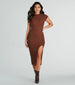 Stay sweet and comfy in this ribbed knit midi dress perfect for any occasion! Designed with cap sleeves, a mock neckline, and a flattering bodycon silhouette, this mid-length dress is trend-worthy with a flirty front slit along the hem. Complete the look with a cute crop jacket and booties!