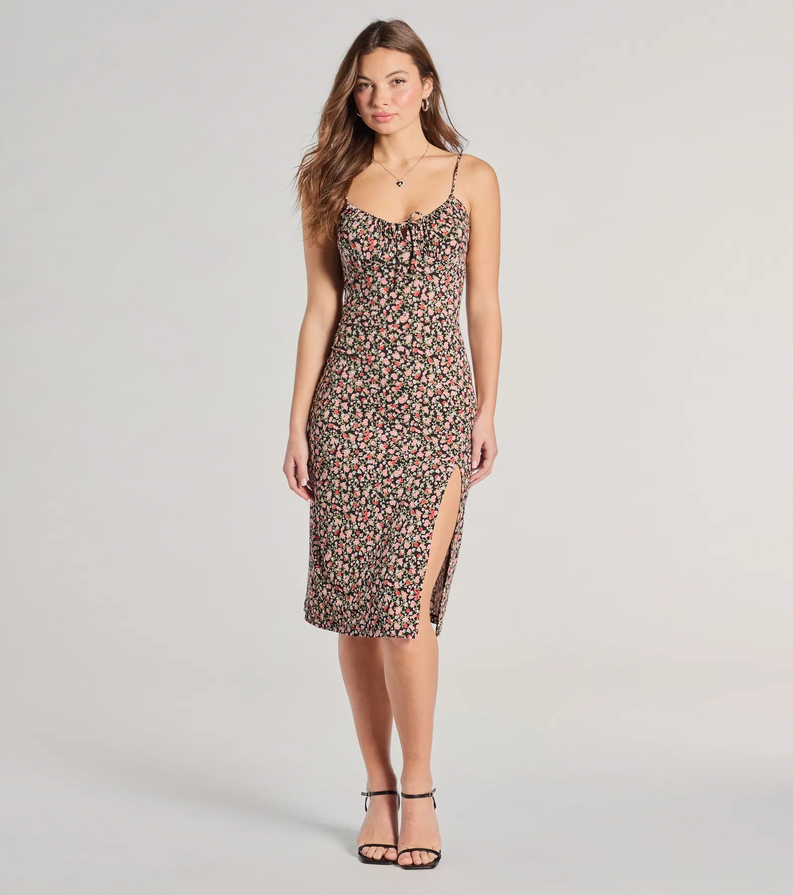 Bring the sweet flair to date night in this high slit ditsy floral midi dress! The all-over ditsy floral print on the stretchy knit fabric is the perfect amount of sweetness with the sultry details of the mid-length dress. The sleeveless scoop neckline features a tie-front at the bust for a cute touch, spaghetti straps, an alluring thigh-high side slit to showcase some leg, and a slim-fit silhouette to showcase your figure. Style this midi dress with a faux leather jacket and heels!