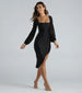 It's time to allure and create a captivating sultry 'fit with this asymmetric midi dress! It features a square neckline, long sheer mesh balloon-style sleeves, a midi-length asymmetric hem creating a chic high-cut side slit, and a form-hugging silhouette. The smooth knit fabric offers plenty of stretch. Complete your dressy night-out look with lace-up heels.