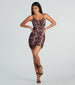 This chic mini dress will refresh your wardrobe for the season! It features a sleeveless V-neckline, adjustable spaghetti straps for a customized fit, all-over ruching for a flattering look, a mini-length hem, a bodycon silhouette that will hug your curves, and a flocked velvet design in a pretty scroll pattern on mesh fabric. Style this mini-length dress with rhinestone fringe earrings and platform heels.