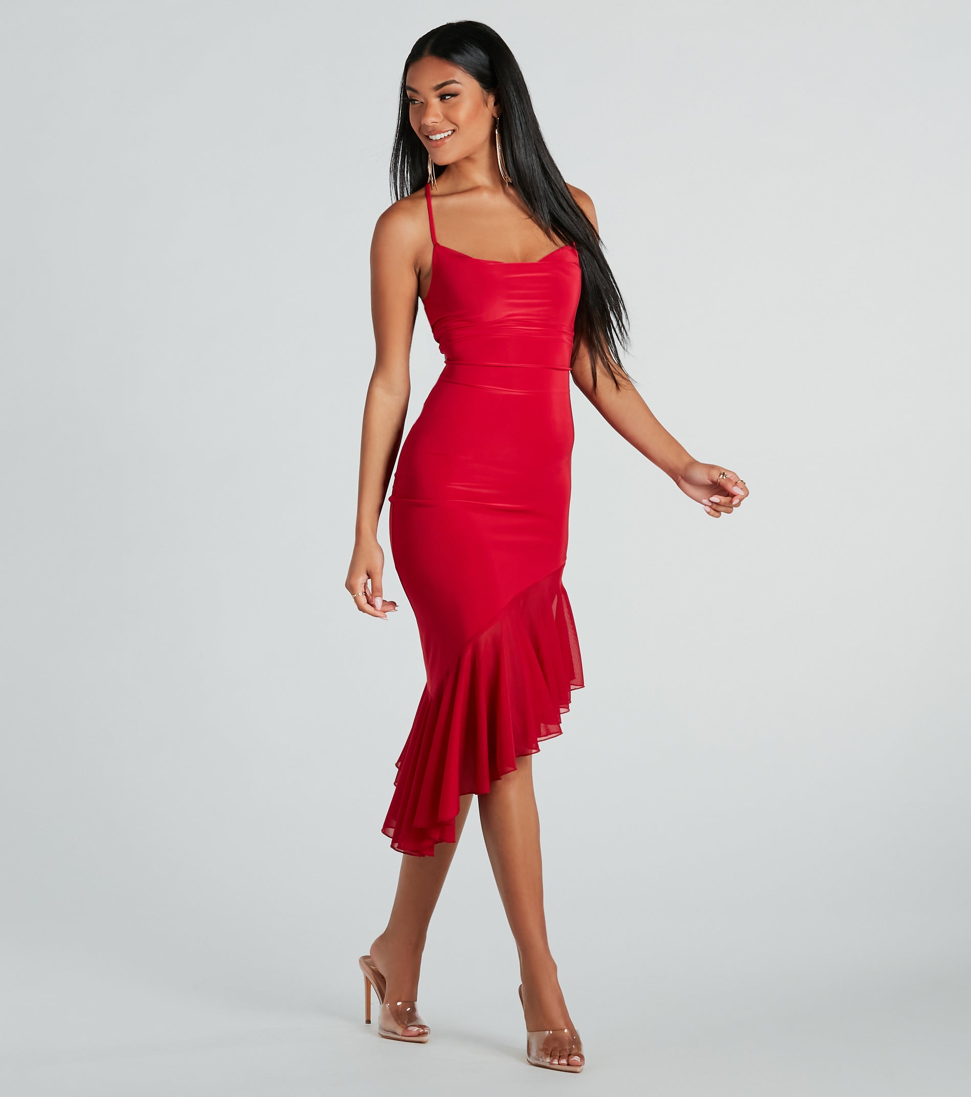 Enjoy the timeless allure of this sleeveless midi dress showcasing a fun and fabulous flair that'll inspire you to get dolled up! The midi-length dress features a sultry cowl neckline, spaghetti straps that shape the open strappy back detail, a curve-hugging silhouette, and an asymmetrical mesh ruffled hem. Complete the look in block heels for a date night!