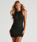 Tonight's vibe is all about this edgy-chic mini dress featuring a sleeveless mock neck with a chain link trim, mesh bust and lightly padded cups, and a bodycon silhouette. Complete the look in mules.