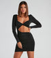 Create a meant-to-be moment in a short dress that makes an unforgettable impression! This updated LBD features a twist-front sweetheart neckline, an asymmetrical cutout at the midriff through the waist, long sleeves, and ruching at the waist through the hem. The dress is composed of a lined smooth knit fabric that offers a form-hugging fit with a moderate stretch. Complete look with rhinestone heels and a quilted faux leather handbag.Â