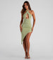 Take your style up a notch and flaunt your flirty side in this halter midi dress featuring a sleeveless bodice, cross straps, a front keyhole cutout, side ruched seams, and a curve-hugging asymmetrical hem. Complete the look in fringe earrings for a dressy night out.