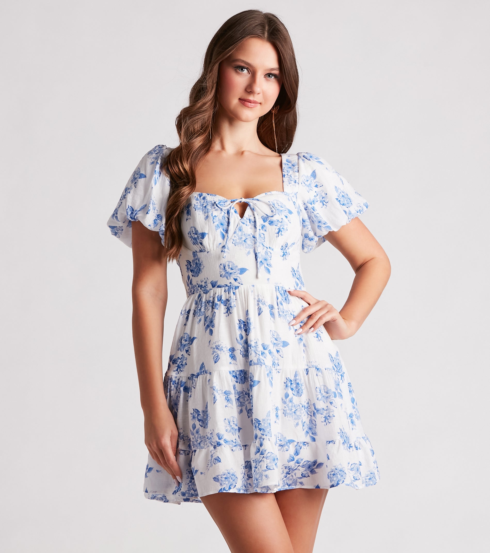 This vintage-inspired floral woven dress is perfect for vineyard weddings, wine tastings, and daytime soirees! The skater dress features adorable short puff sleeves, a sweetheart neckline with a bust tie, a lace-up back design, and a tiered fit-and-flare skater silhouette with a short hem. The lined woven fabric showcases a vintage floral print pattern. Style this short dress with on-trend strappy mules.