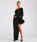 The Vivian formal dress will let you showcase your dramatic chic side! She features a one-shoulder neckline with a shoulder pad to provide structure, a bold long flared sleeve with a trendy feather trim, a floor-length asymmetrical hem creating a thigh-high side slit, and a curve-hugging silhouette. The crepe knit fabric offers a moderate stretch. Style with strappy stilettos for your next fancy gala!