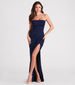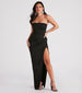 Captivating yet subtle details create the eye-catching Whittney formal crepe dress perfect for fancy parties, cocktail events, and galas! She stuns in a classic strapless square neckline with a padded bust, a fitted bodice, and a pleated side seam that creates the illusion of an hourglass figure. Her curve-hugging, slim-fit silhouette offers a show of skin in a high-cut front slit and a long-length hem that gracefully sweeps along the floor. Complete your dressy look in this formal long dress with earrings and simple block heels!