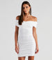 Get all wrapped up in chic style in this curve-hugging mini dress. It features an off-the-shoulder sweetheart neckline, short sleeves, a wrap-front overlay, ruching down the side seams, and a short, bodycon silhouette. Style with clear heels and a sleek clutch.